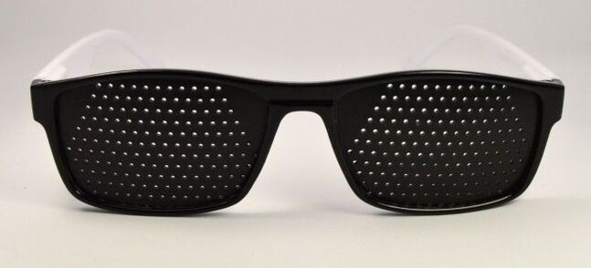 A kezelés bemutatott változata a legvitatottabb. Ezek a szemüveg egy perforált fekete műanyag lemezekkel rendelkező keret. A lyukak kicsik és többszörösek, álnév -sorrendben helyezkednek el. Hosszú ideig a lyukas szemüveget egyszerűnek és olcsónak tekintették, hogyan lehetne javítani az otthoni látást, összehasonlítva a professzionális szimulátorokkal a hatékonyság szempontjából, de a gyártók nyilatkozatainak nincs bizonyítéka.